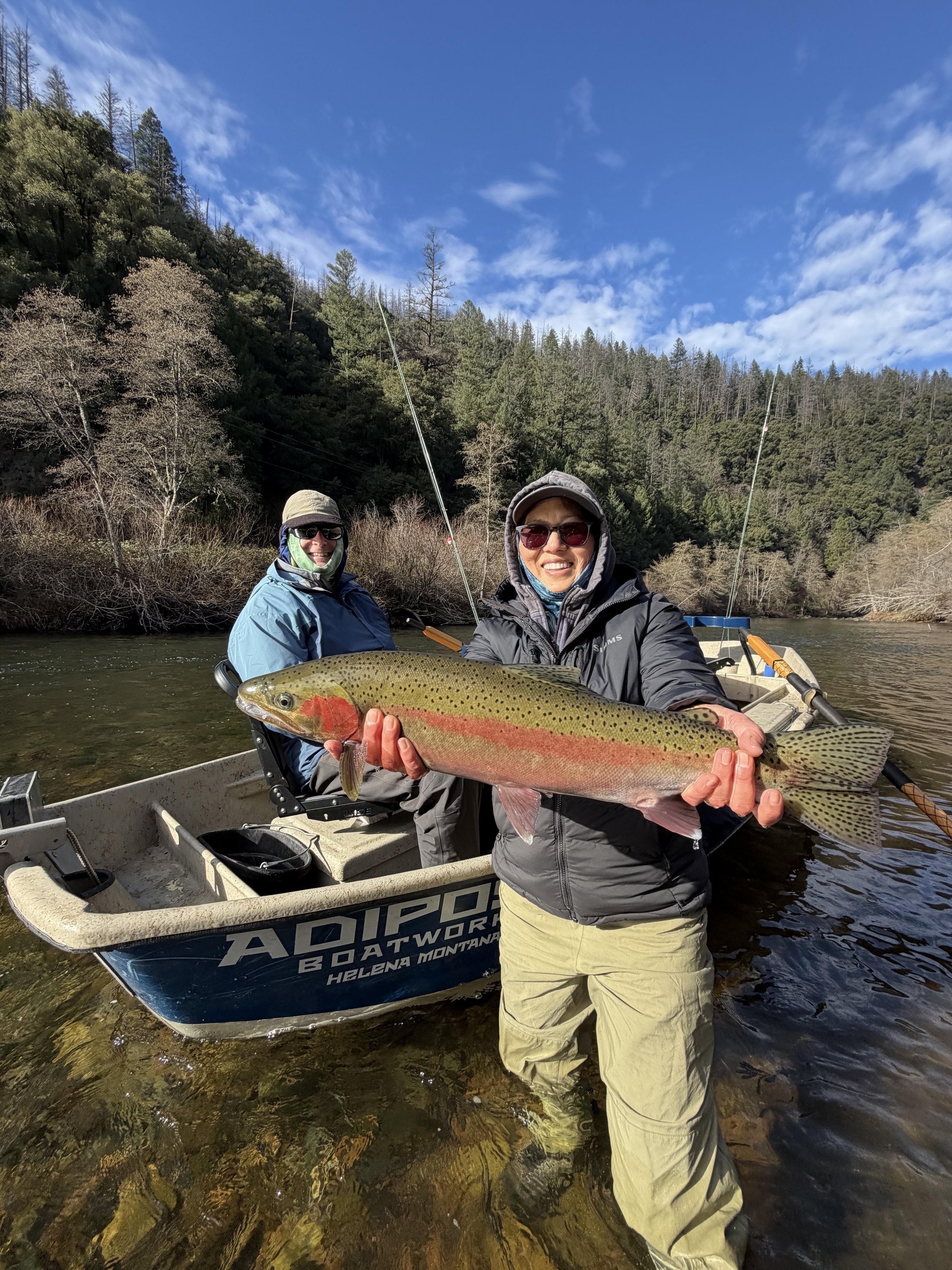 Eileen with one of several nice wild steelhead she landed on the Trinity River in December. Days were cold… but the fishing was not!